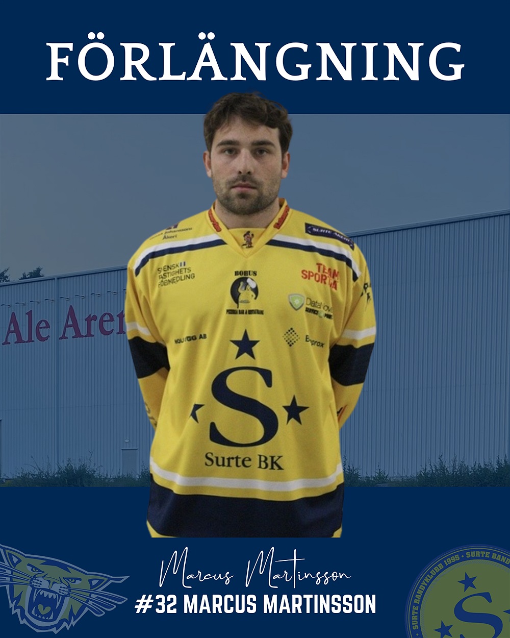 Målskytten Marcus Martinsson 26 har förlängt sitt kontrakt med Surte den kommande säsongen.