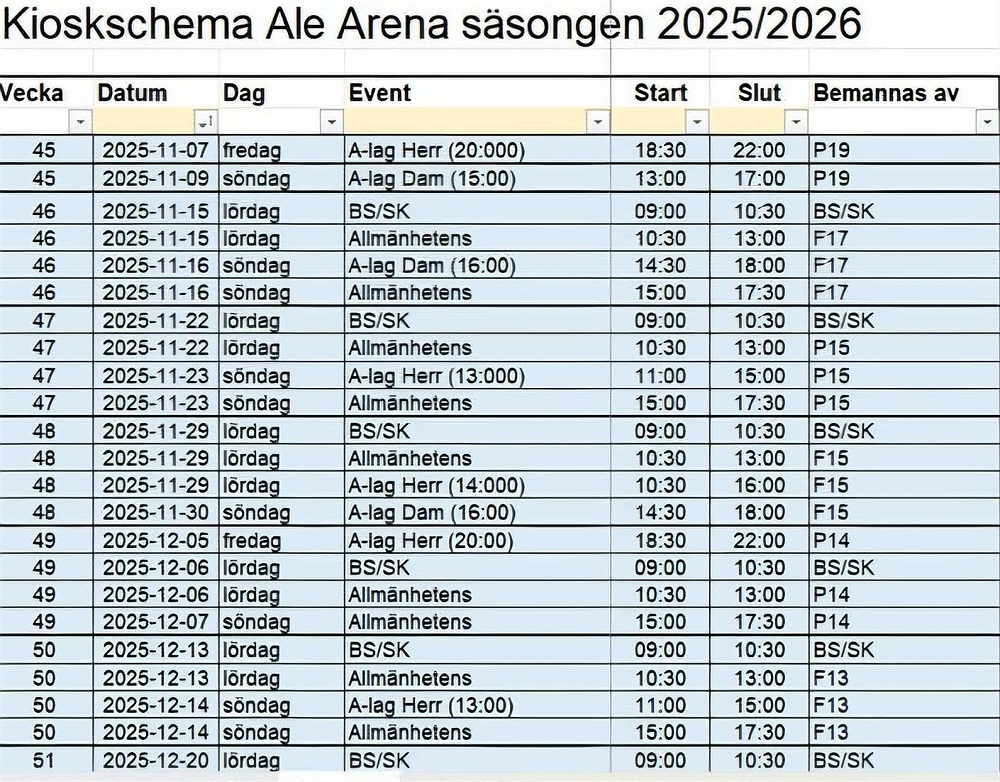 Nu är schemat för kiosken/Kafé Kakservice säsongen 25-26 klart och finns att tillgå för alla under menyn dokument och mallen kiosk.